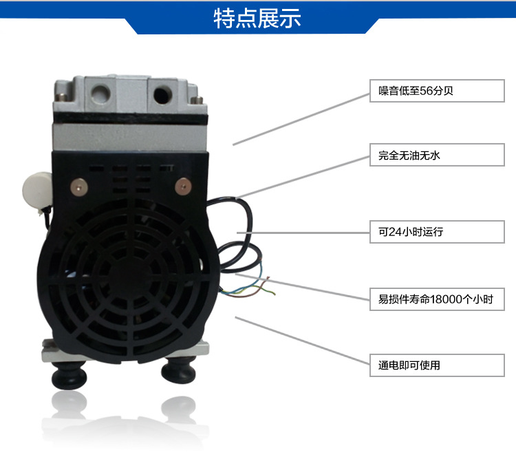 • 產品特性:1.壓力高達8公斤。 2.配有橡膠減震腳墊,運行更平穩。 3.100%無油、免維護。 4.靜音、噪音控制在56分貝左右。 5.體積小外形美觀。 6.都裝有過載保護器,不會因超負荷燒壞。 7.免費配送小配件:消音器、減震墊、氣管接頭