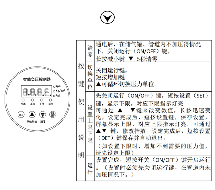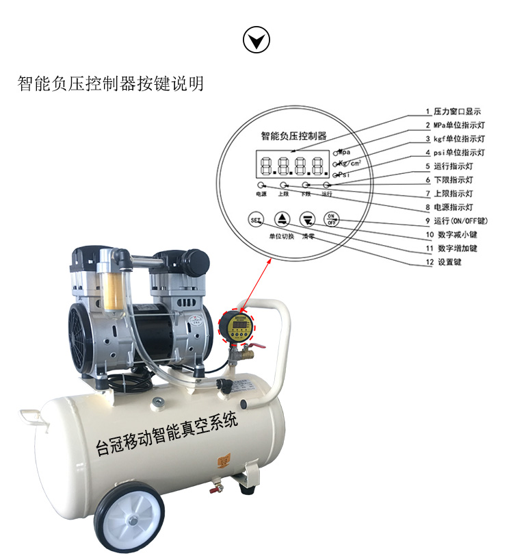 智能壓力控制器:高精度光電原理控制,0-負98KPA內自由調節上限(停止),下限(啟動)。